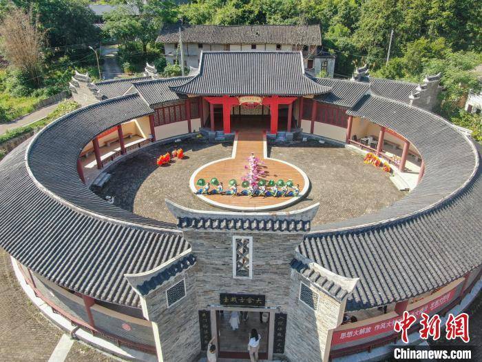 图为航拍大畲村古戏台,一场精彩的石城灯彩表演正在上演。 刘力鑫 摄