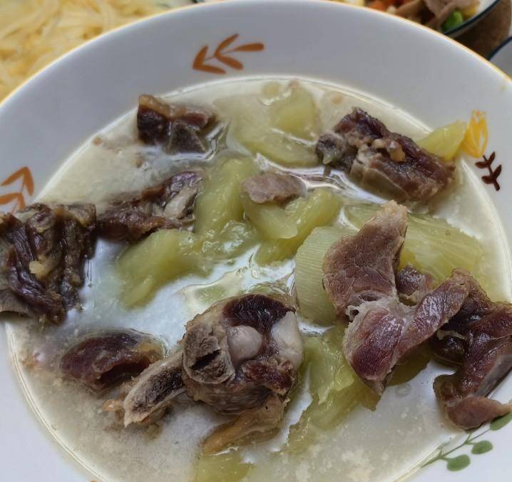 王大姐还准备了顺滑的蒸蛋,热腾腾的蛋香味十足。这些看似都还不错,但是还有两道菜,就是程木青碰都不敢碰的菜了。这个腊肉切成薄片和青椒油麦菜一起炒,油麦菜清爽可以中和油腻,腊肉也特别香,腊香味十足。还有切成小块的腊排骨和青笋一起炖煮,汤香味浓很入味。好是好吃,但是程木青不爱吃腊肉,觉得不健康。