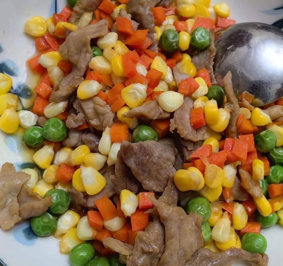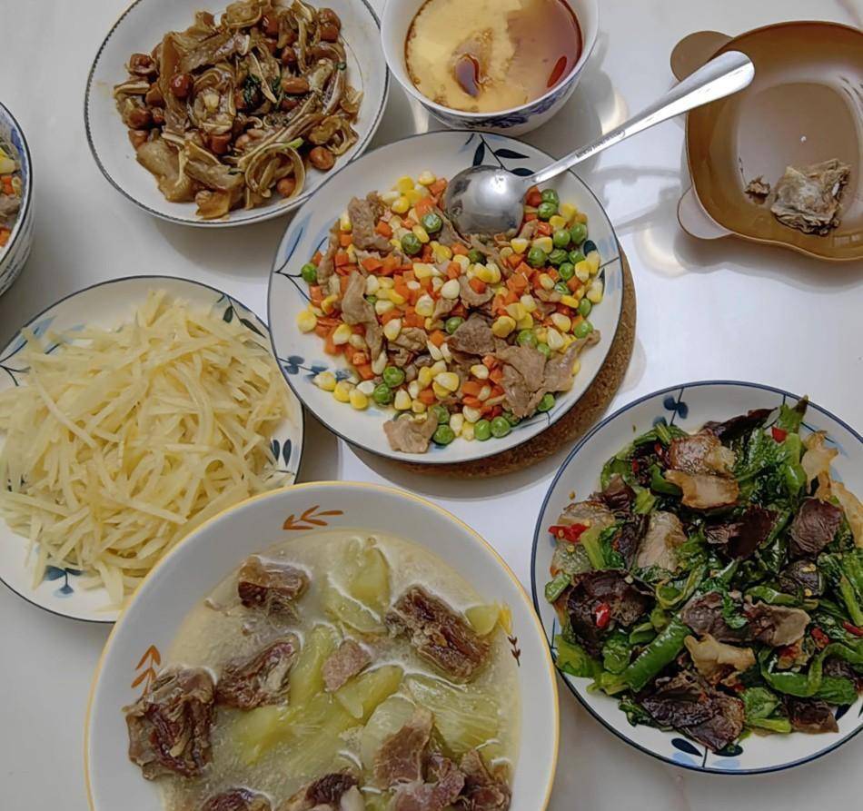 程木青晒出婆婆做的午餐和晚餐,来看看这个午餐,其实还好,没有什么红彤彤的辣椒菜。这个土豆切成丝清炒就很爽口。牛肉炒香之后,用余油炒胡萝卜丁玉米和青豌豆,这样炒出来的菜味道香浓又带着蔬菜的清香,吃起来不腻,三丁搭配得很好,不仅营养丰富,而且味道香甜。