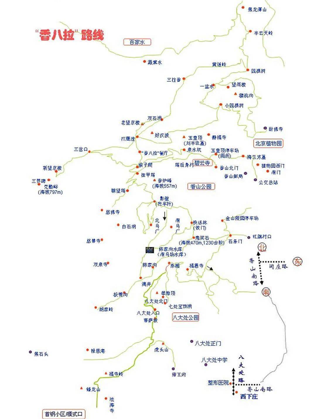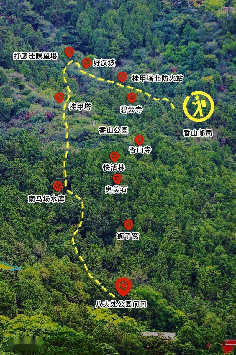 香山邮局——挂甲塔北防火站——好汉坡——打鹰洼瞭望塔——挂甲塔——南马场水库——八大处