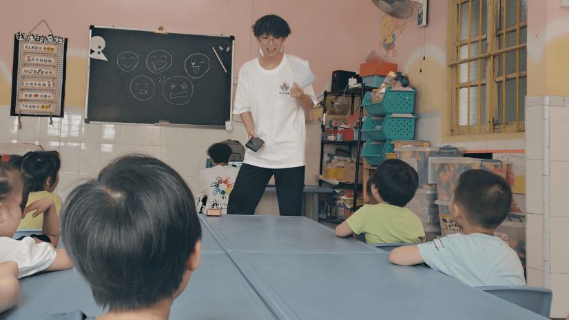 我们的音乐小老师通过播放一些不同情感的音乐带领孩子们从中感受到音乐的乐趣和音乐带来的惊喜,让孩子们去感受音乐,整个过程,孩子们沉浸在美妙的音乐中。接着,我们负责教他们唱歌的队员耐心地讲解和吟唱着一句句歌词,孩子们也都非常积极主动地跟着老师的节奏去吟唱,在跳动的音符上大胆歌唱,就是我们最理想的效果。