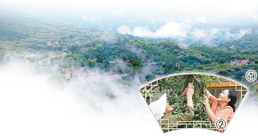 图①为丹巴县甲居镇乡村风光。 降初泽郎摄 图②为降初拉姆(右)和村民一起采摘青脆李。 钟兴建摄