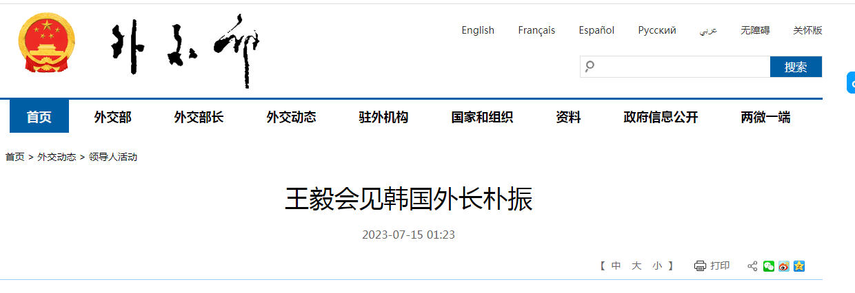 当地时间2023年7月14日,中央外办主任王毅在雅加达应约会见韩国外长朴振。