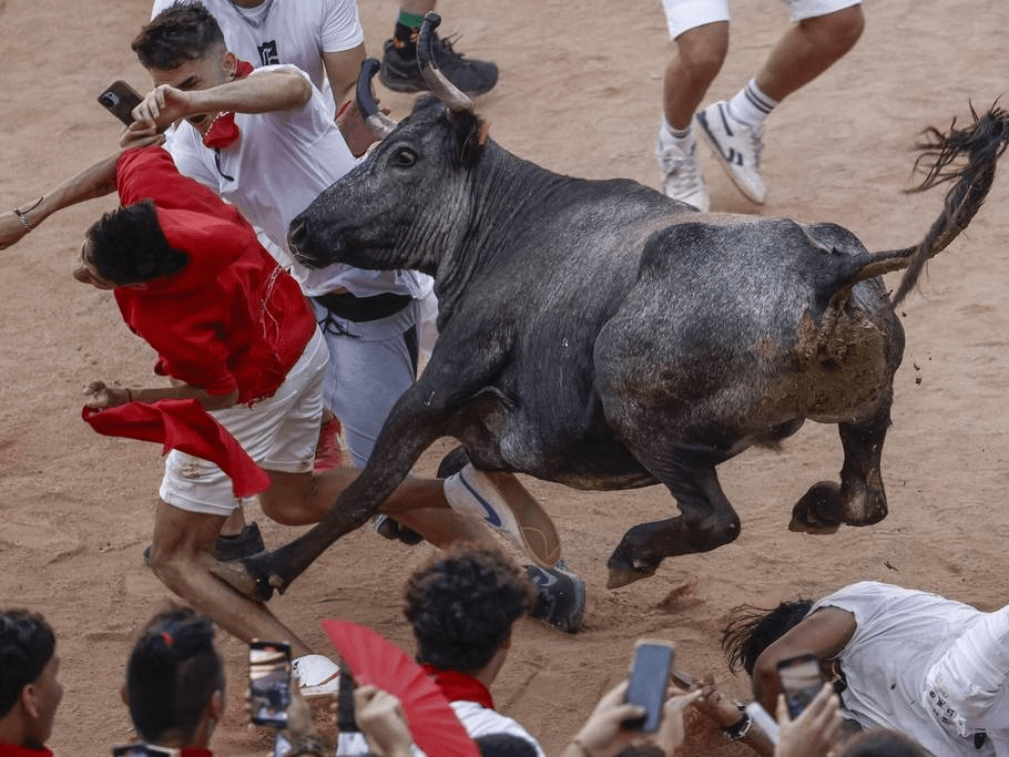 西班牙潘普洛纳,奔牛节上,公牛在追逐狂欢者。