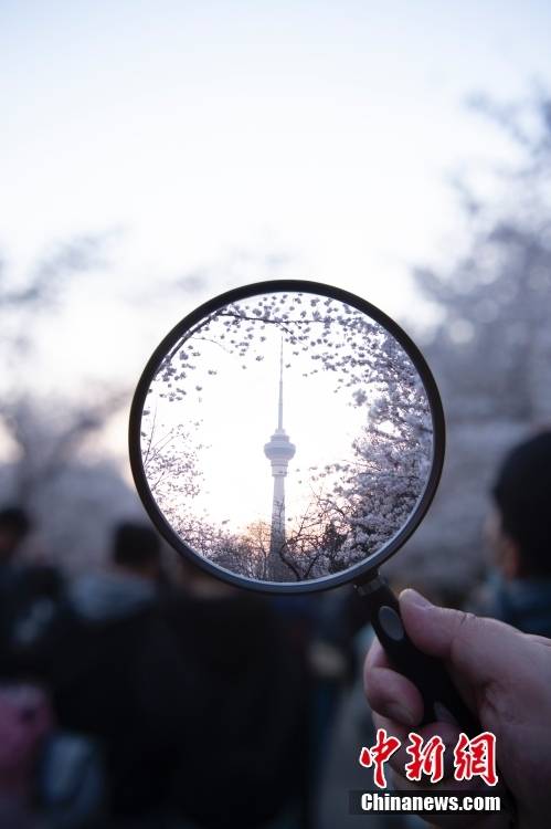 玉渊潭公园樱花与中央电视塔构成一幅美丽画卷。(合成图片)