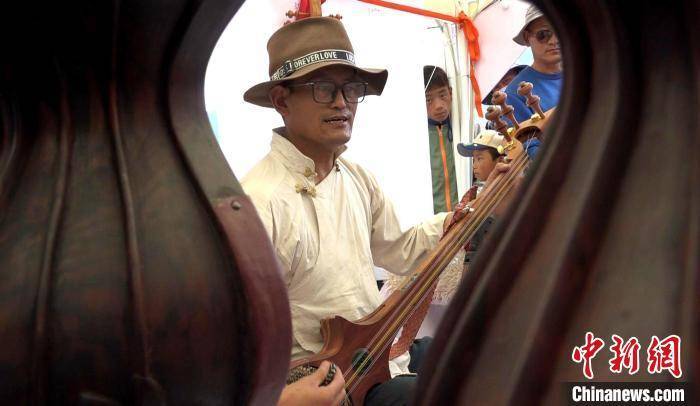 图为商贩边卖民族乐器,边弹唱当地经典民歌。 贡桑拉姆 摄