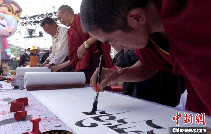 图为在“松赞夜市”非遗展台僧人书写藏文书法。 贡桑拉姆 摄