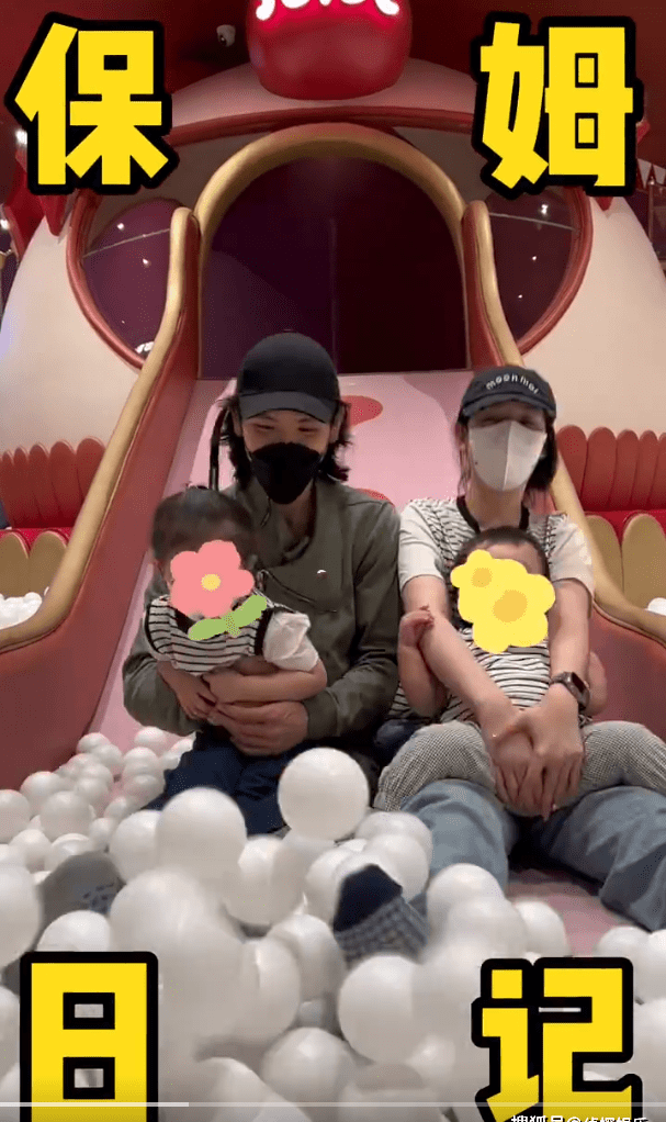 向佐和郭碧婷戴着情侣款棒球帽,一人抱着一个娃出镜,画面温馨有爱。