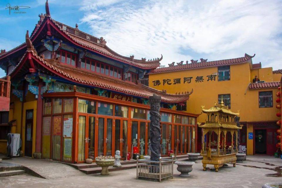 在枸杞岛的“山海奇观”景区游玩时,发现它旁边有个“观音禅寺”,虽没有特别金碧辉煌的华丽建筑,但也由数幢不同风格的大雄宝殿、斋堂香堂及多间厢房组成。可能是受海岛的自然环境和天气影响,它的临海房屋多为黄墙平顶,靠里一些的倒不失“飞檐斗拱”,且以红色为主。估计建造年代也有不同,或者历任主持个性迥异,所以无论整体布局还是造型,看上去都略显杂乱,并不统一。