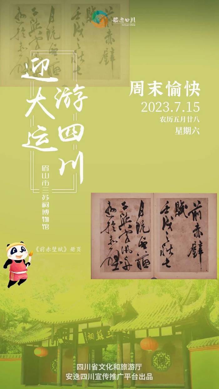 今日安逸四川日历海报“迎大运游四川”走进眉山三苏祠博物馆,从馆藏苏轼名篇《前赤壁赋》中感受“寄蜉蝣于天地,渺沧海之一粟”的豁达淡然。