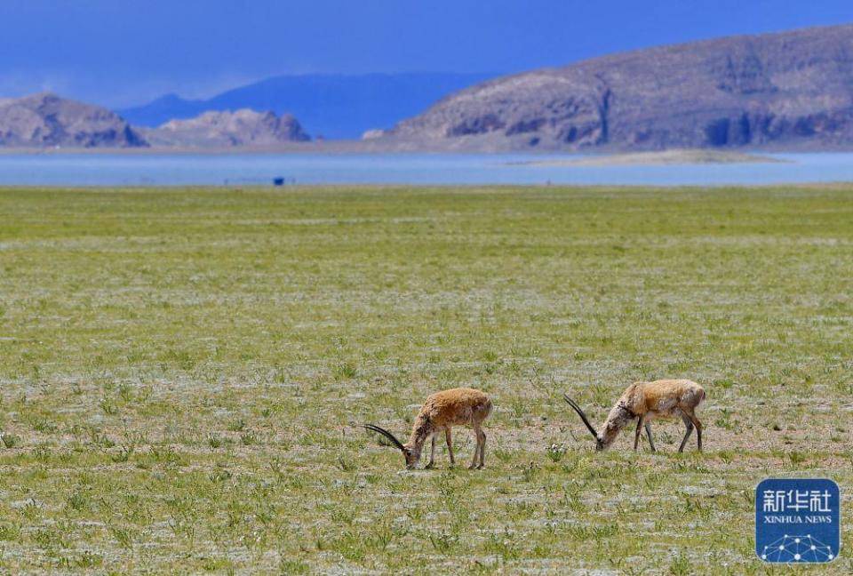 ↑藏羚羊在色林错畔草原上觅食(7月11日摄)。新华社记者 邵泽东 摄