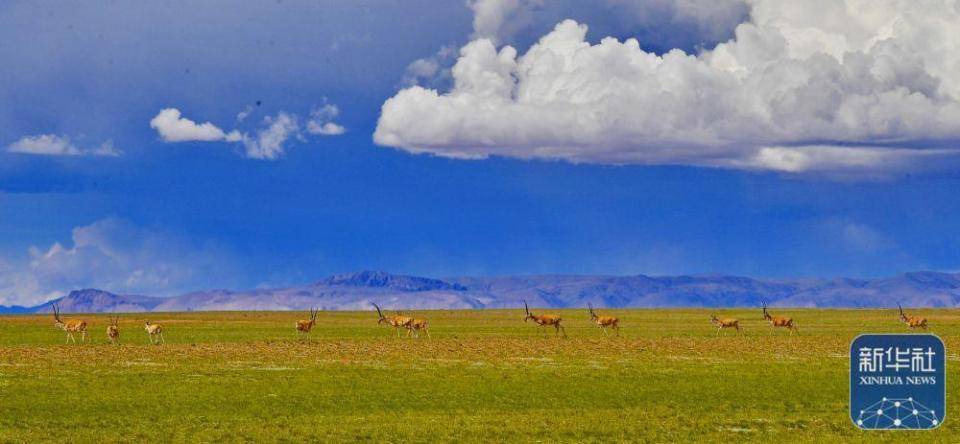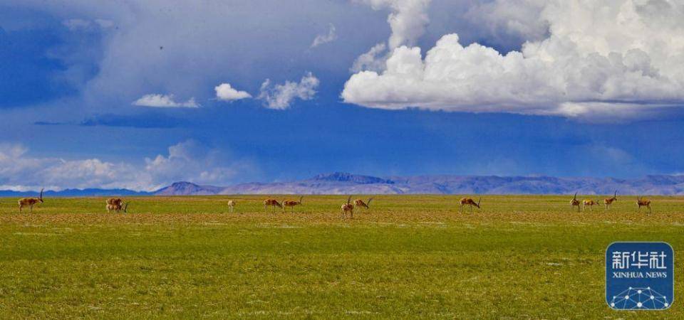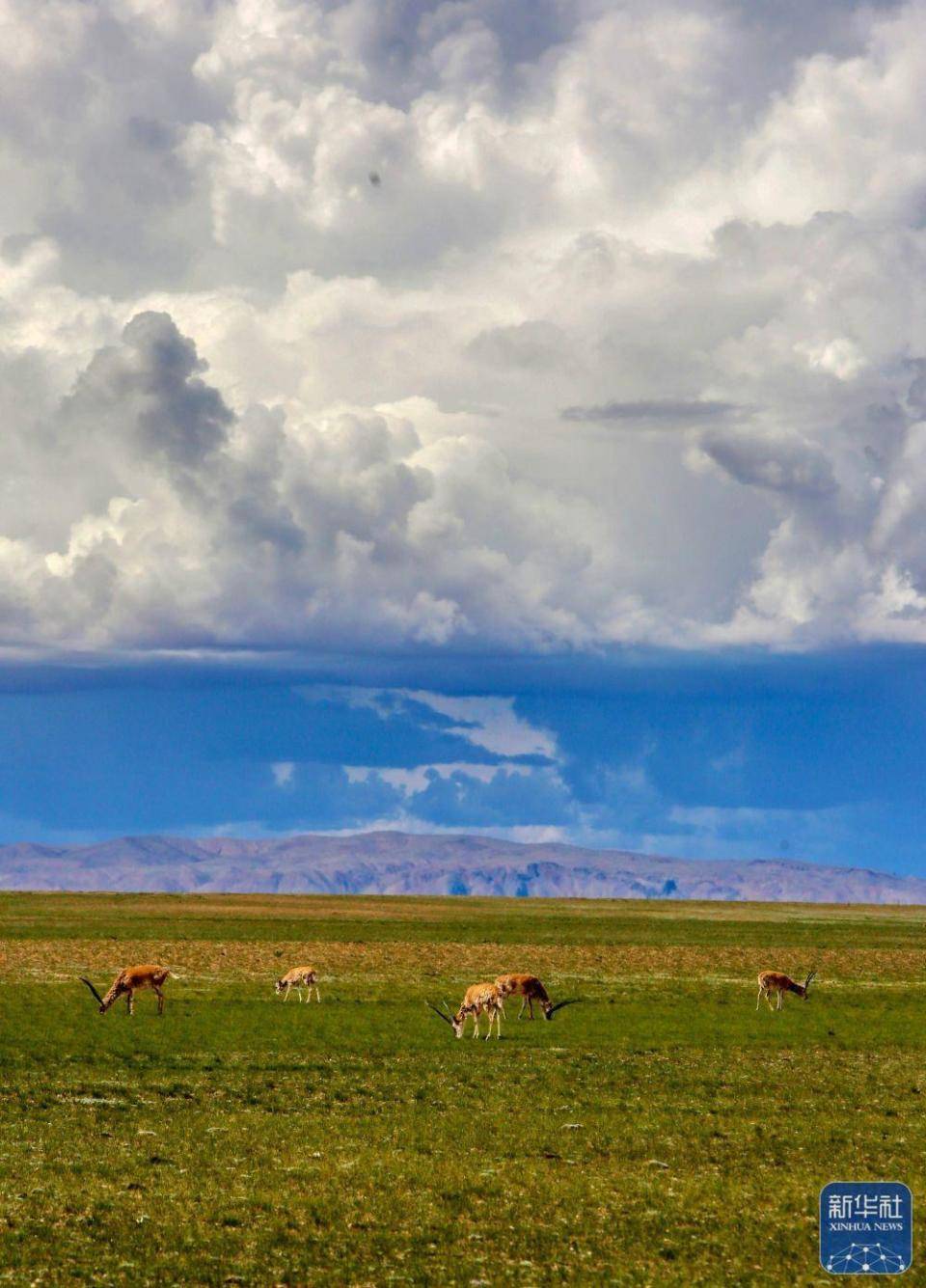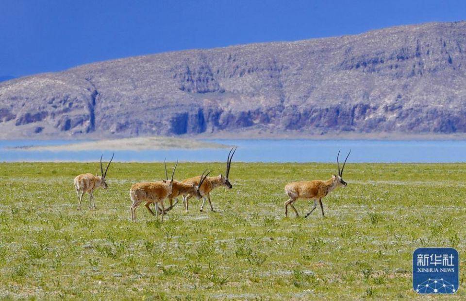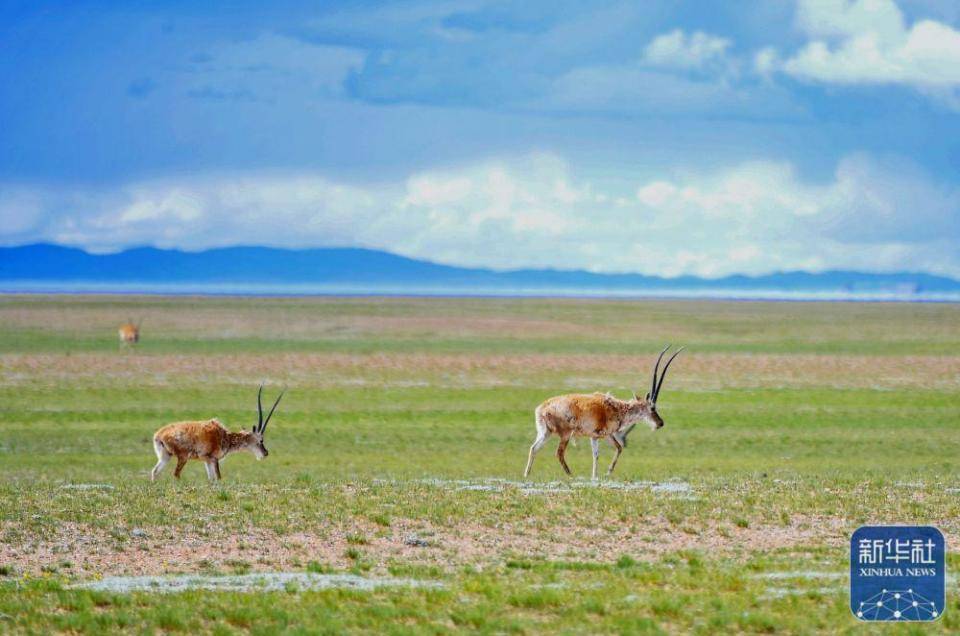 ↑色林错畔草原上的藏羚羊(7月11日摄)。新华社记者 刘洲鹏 摄