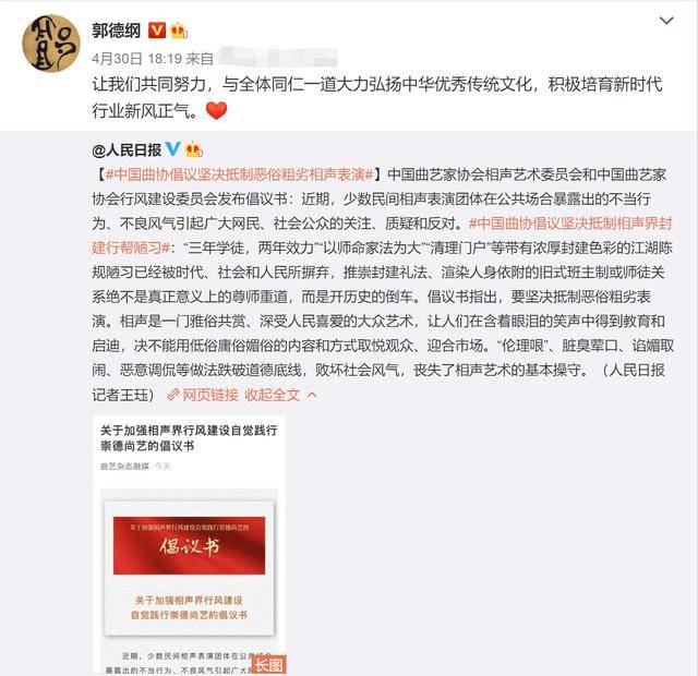 两人的“恩怨”暂且不多议论,但也不得不承认,倡议书所倡导的方向确实是没错的。大家一起努力,让相声行业往好的方向发展,难道不好吗?