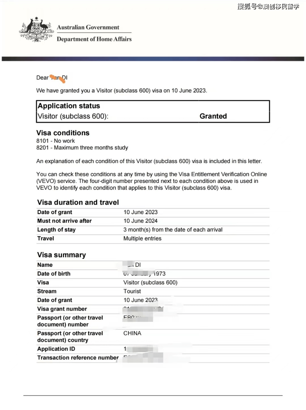 今天分享的D女士去澳洲探望女儿的成功案例,恭喜D女士顺利获批澳洲600签证!