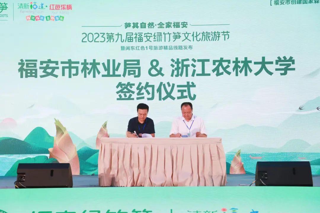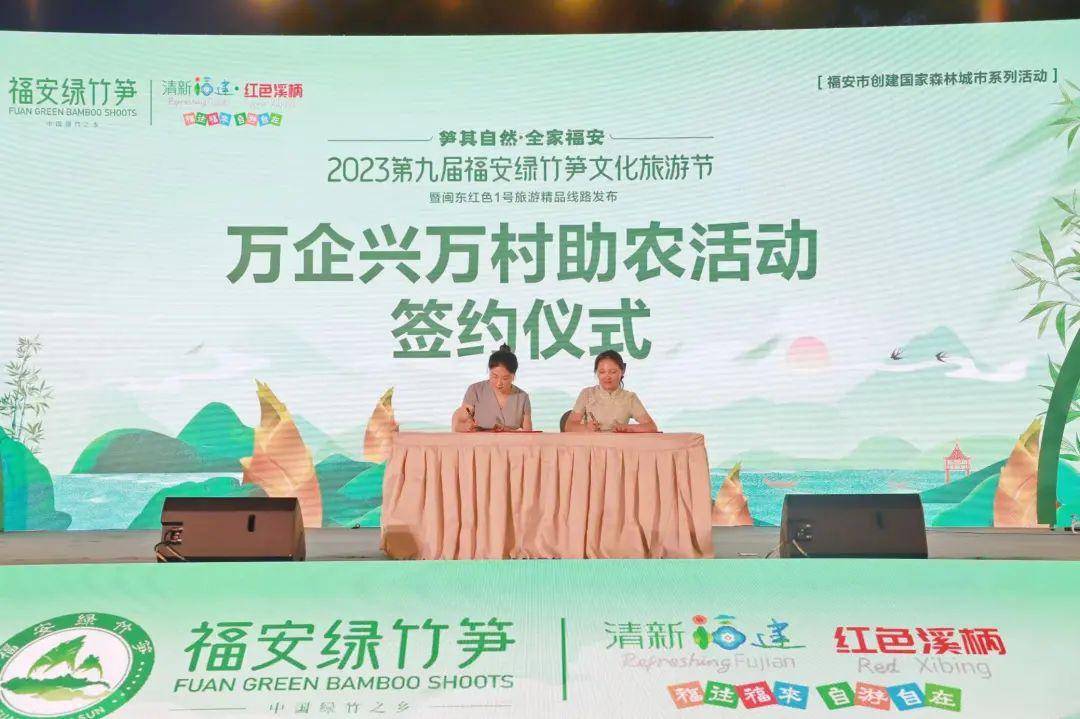 开幕式现场,与会领导和嘉宾共同为活动启幕。浙江农林大学竹子研究院与福安市林业局就绿竹产业科技创新签约;福安市北京商会代表、北京林鸿茂茶叶有限公司与福安市黄兰种植专业合作社签订“万企兴万村”助农协议。