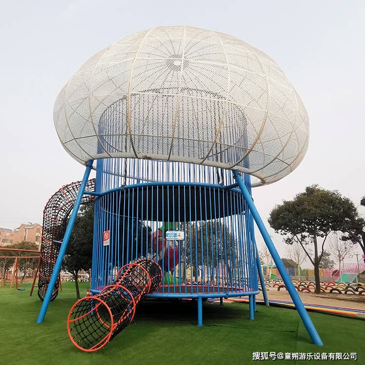 5.水母蹦床是一种新型无动力游乐项目 ,外观呈圆形,底座是蹦床里面共有两层,由钢架+绳网围绕起来,可有效的保护孩子。同时,它还有一个霸气的顶棚,让整个设备看起来更加引人注目犹如孩子们喜欢的海底动物水母一般,所以叫水母蹦床 。