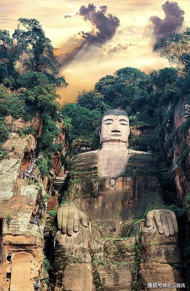 乐山大佛,是世界上有名的佛像。它枕水而建,临江开凿,距今已有一千多年的历史。气势恢宏的佛像坐落在周围的绿树山林中,实乃人间奇迹。此外,佛像周围还建造了90多座小神龛,错落有致,实乃佳作。