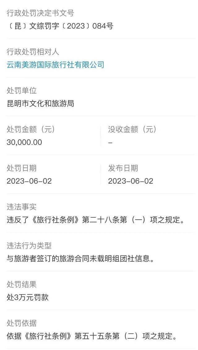 记者查询该旅行社工商资料发现,该旅行社此前名为云南沣旅国际旅行社有限公司,今年3月30日更名为云南美游国际旅行社有限公司,更名前的3月7日,该旅行社曾因在同一个月内因负主要责任而产生2次及以上投诉,被昆明市文旅局列入黑榜;3月15日,该旅行社被云南省文旅厅列为重点监管的旅行社。即便更名后,该旅行社仍多次被列入当地旅行社黑榜,6月2日因违反相关规定被昆明市文旅局处以3万元的行政处罚。