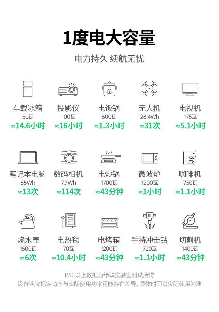 举个例子,以600瓦电饭锅为例,1度电的能量足够让它持续工作1.3小时,显然远远超出了户外露营需求。即使是1500瓦的烧水壶,绿联GS1200也可以让其烧开6壶水,电力充足,完全满足我们的需求。而对于手机、电脑等数码产品,更是可以随心所欲地使用,彻底告别了用电焦虑。