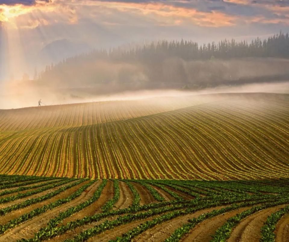 画面上,一垄一垄刚冒芽的树苗泛着不同级差的绿色,近景的深绿渐变成中段的淡绿,中段的淡绿又连接着远处的黄绿,就在以“绿”为主题的大地上,摄影家借助透过云雾洒在土地上的光影,构成了波浪起伏的曲线,酷似天籁之声的旋律,又似生命的河流。再仔细看,阔大的土地上竟然有人!这是占画面不到千分之一、正在躬耕陇亩的劳动者。他的侧影几乎融进了阳光,淡淡的、隐隐的、默默的。