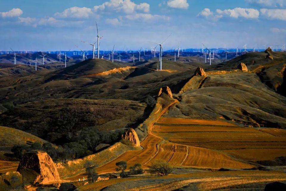 图片的前景是夕阳投射在黄土高坡上的暖色调,中长焦镜头拍到的远景是与地平线相交的深蓝色调。虽然深绿色是二者之间的过度,但夺人眼球的还是色与形构成的对比。一是蜿蜒的明代长城上五个烽火台与现代风力发电机的对比,以此引发观众的思古之幽情;二是雄立于黄金分割线上的白色风力发电机的大摇臂与广袤高原的对比,吸引着观众的注意力;三是色彩构成的对比:深黄与深蓝、深黄与浅蓝之间的补色反差,暗喻着古今对比;四是横线为主的画面上,突兀地耸立起竖线物象,形成了视觉反差的对比;五是象征着古代华夏智慧的长城,与当代中国在科技领域“与时俱进”带来的社会发展的对比;六是人文景观与自然景观和而不同、不同而和之间的对比。这一切,都是耐人寻味、发人深省的。