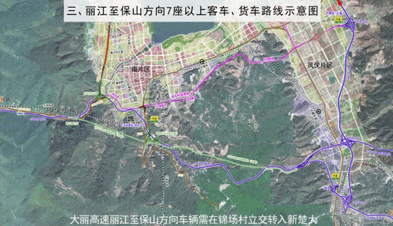 大丽高速丽江至保山方向车辆需在锦场村立交转入新楚大,沿新楚大主线行驶至塘子铺互通主线后转入老高速下行线去往保山方向。