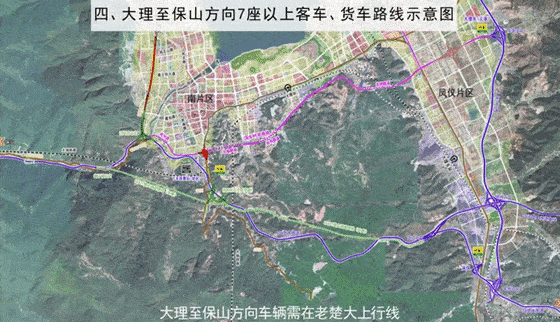大理至保山方向车辆需在老楚大上行线(或大丽联络线)行驶至丰乐立交(锦场村立交)转入大丽高速,由大丽高速行驶至锦场村立交转入新楚大,经新楚大行驶至塘子铺互通主线后转入老高速下行线去往保山方向。