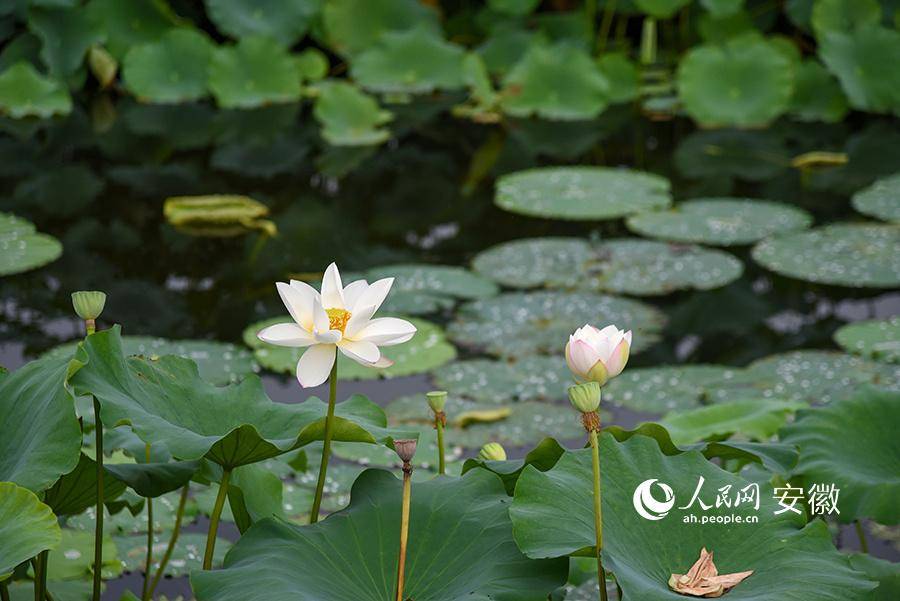 荷塘荷花竞相绽放,荷叶清幽碧绿。人民网 李希蒙摄
