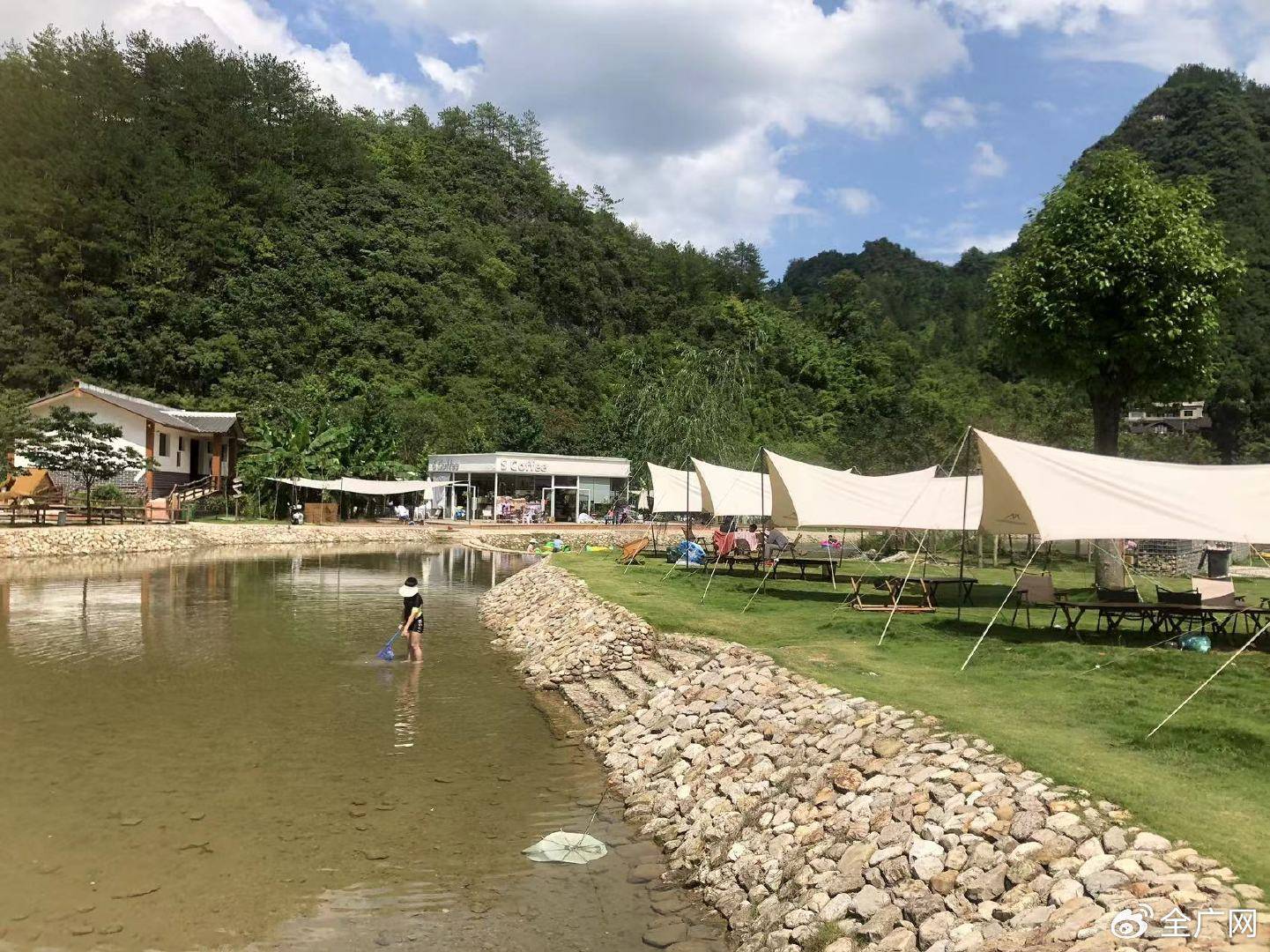 乌当区自然风光秀丽,森林覆盖率达59.73%,从市区驱车一个小时,便可到达童梦溪田景区。这里群山环绕,茵茵草地上支起大大小小的帐篷,清澈见底的溪水,游客们正在水中嬉戏。