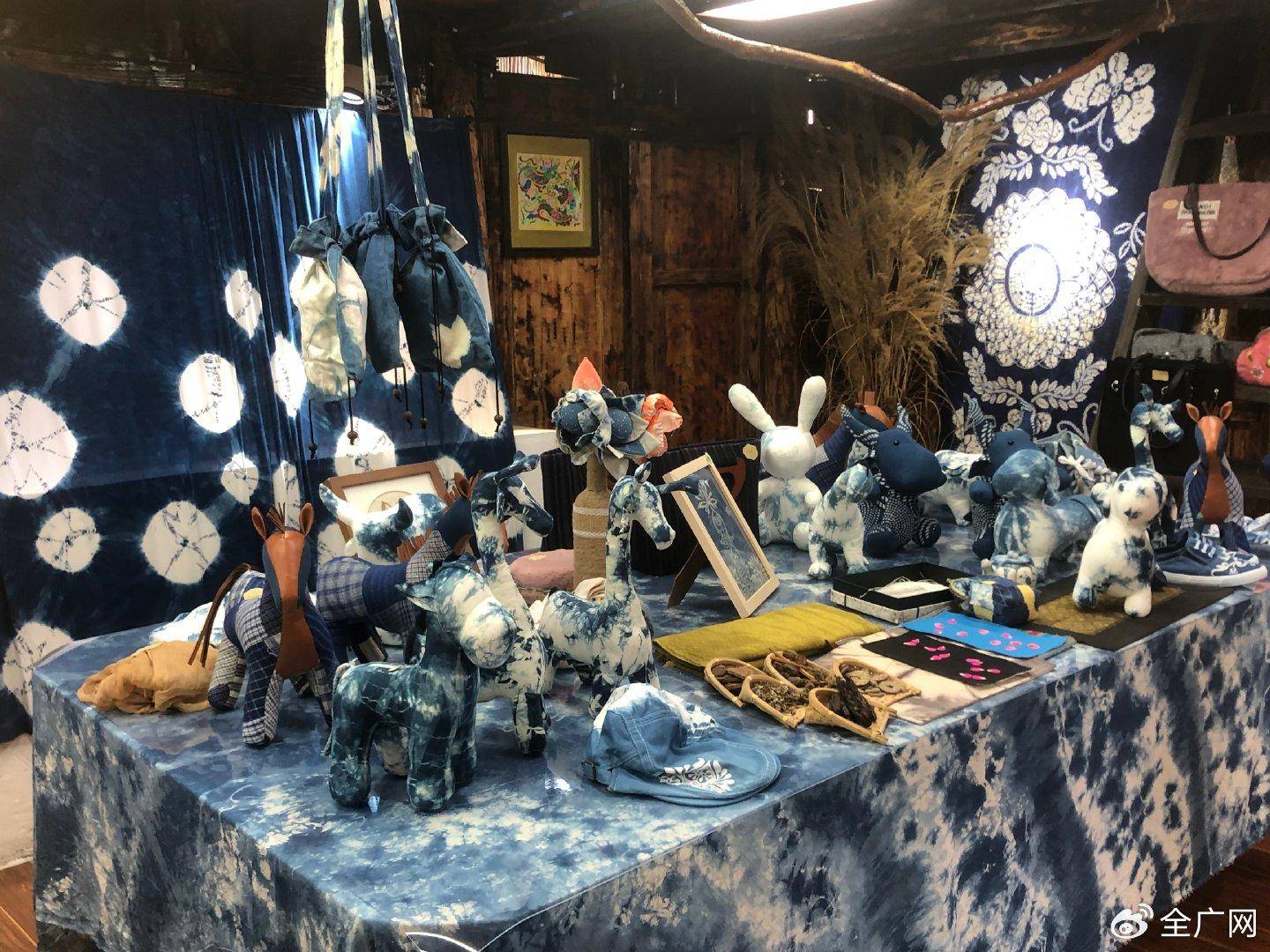 在扎染文创陈列间里,桌布、披肩、短袖、开衫、旗袍、裤子、壁挂、折扇、抱枕、生肖玩偶琳琅满目,游客们穿梭其间,挑选着心仪的扎染文创工艺品。
