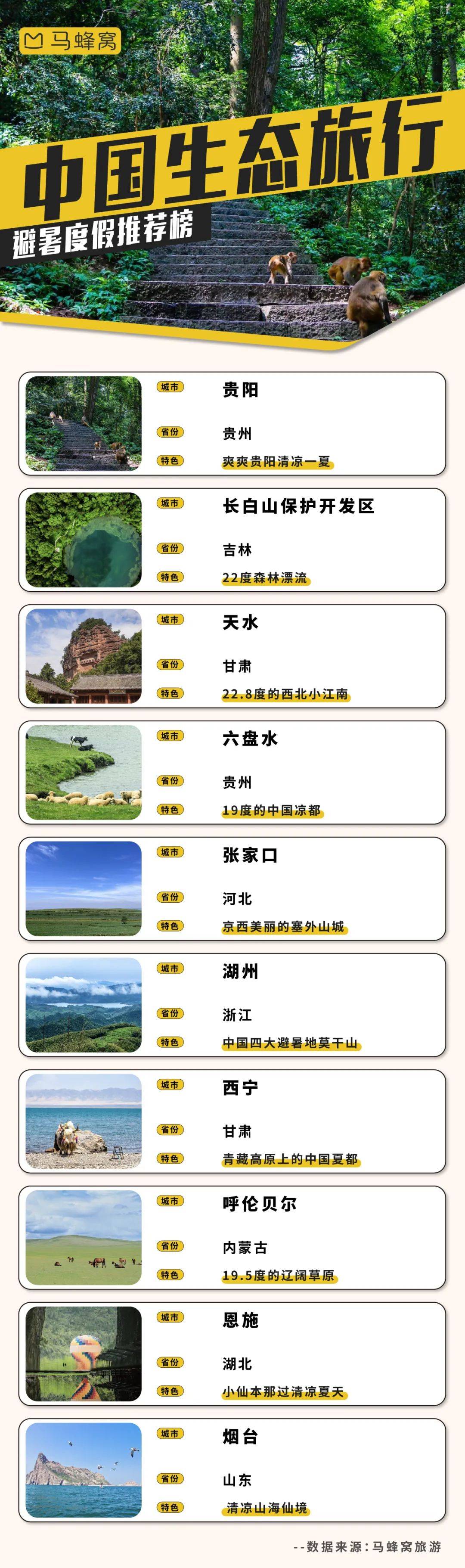 马蜂窝大数据显示,自六月起持续至今的高温模式让“避暑游”热度屡创新高,近一周“夏季避暑胜地”热度环比涨幅更是高达450%。得天独厚自然的生态环境,超过60%的森林覆盖率,让贵州毫无意外脱颖而出,成为众多游客的避暑游首选。 “爽爽贵阳”在“避暑度假推荐榜”上一举夺魁。