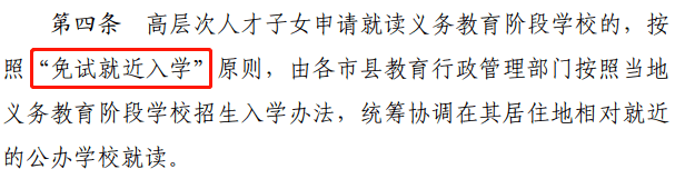 高层次人才子女申请就读义务教育阶段学校的,按照“免试就近入学”原则,统筹协调在其居住地相对就近的公办学校就读。