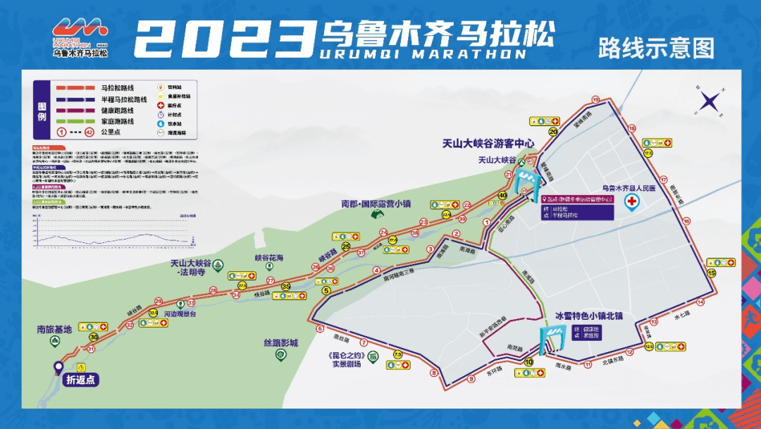 马拉松起点设置在新疆冬季运动管理中心,参赛选手将途经乌鲁木齐天山大峡谷景区、冰雪运动小镇、南旅基地、水西沟镇等景观地点。