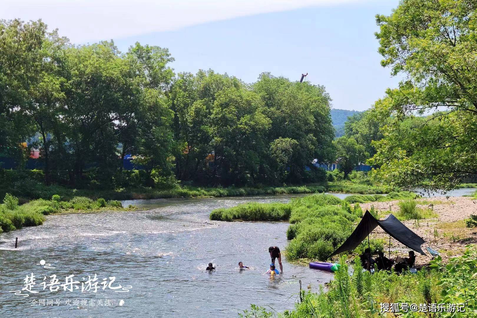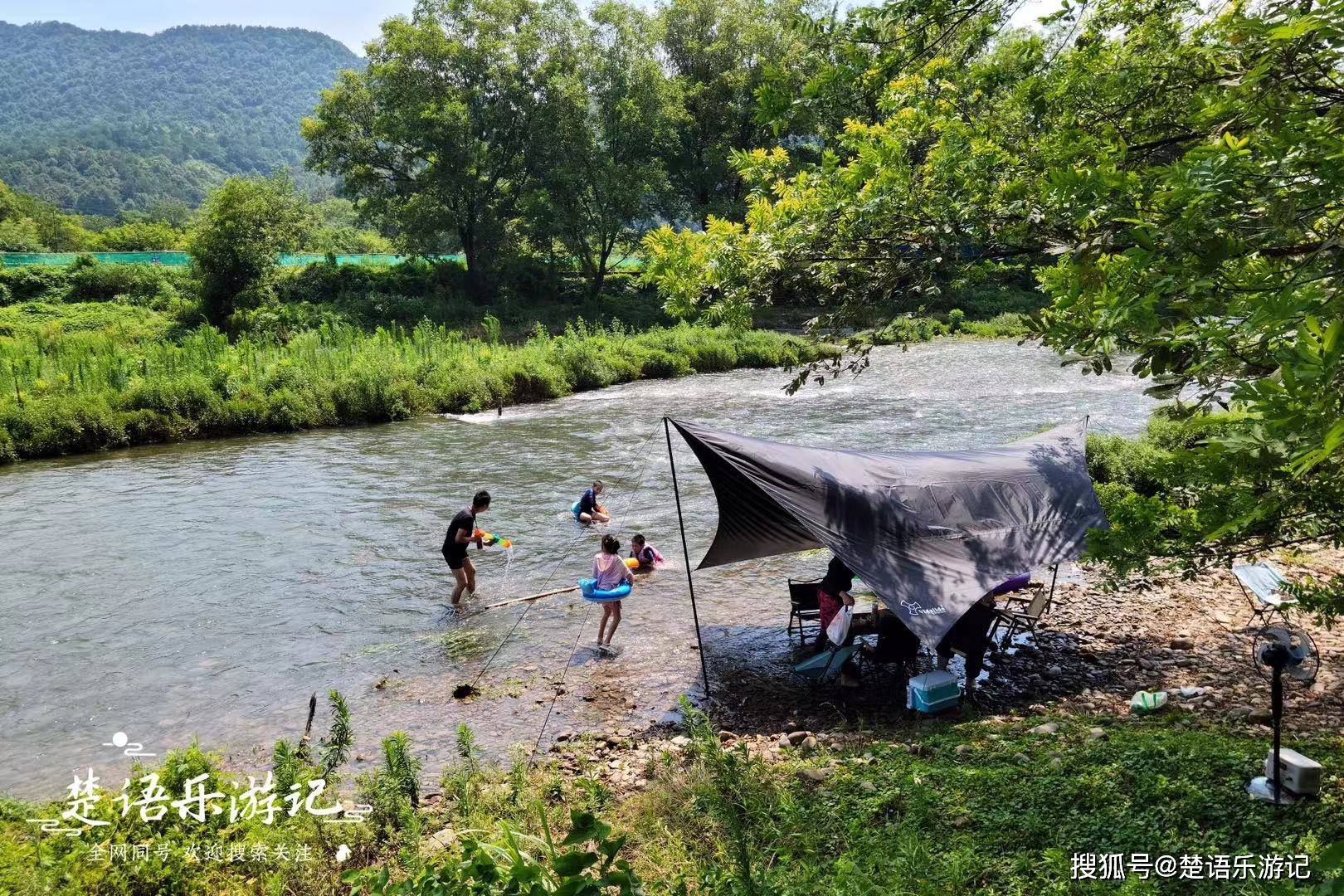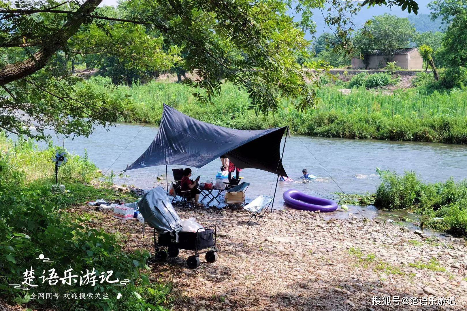 这样的场景,有水,有颜,有阴,有凉,成为玩水和避暑的好去处。所以,当晴江岸人满为患时,部分游客溯溪而上,寻到这里,在石滩上搭建天幕或者帐篷,在水上支起桌椅,享受清凉的露营生活。