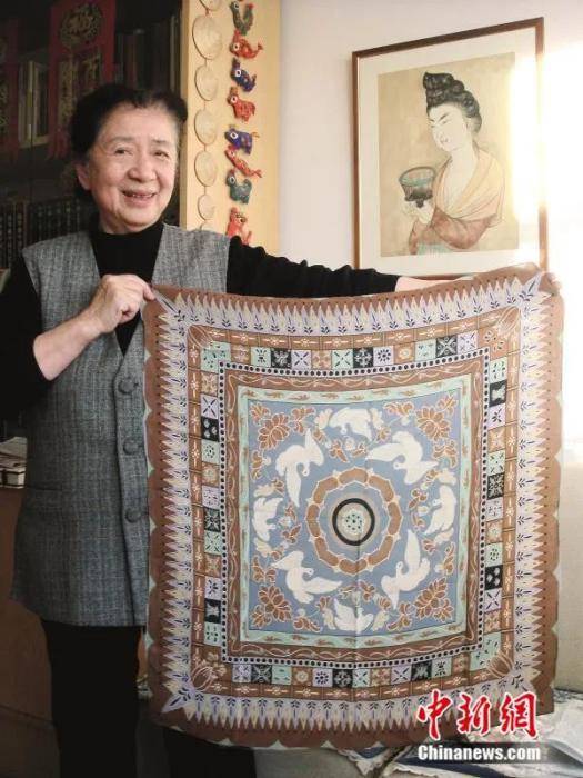 常沙娜与“和平鸽”头巾合影。受访者供图