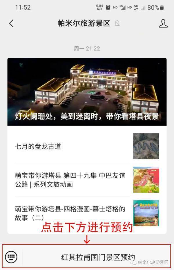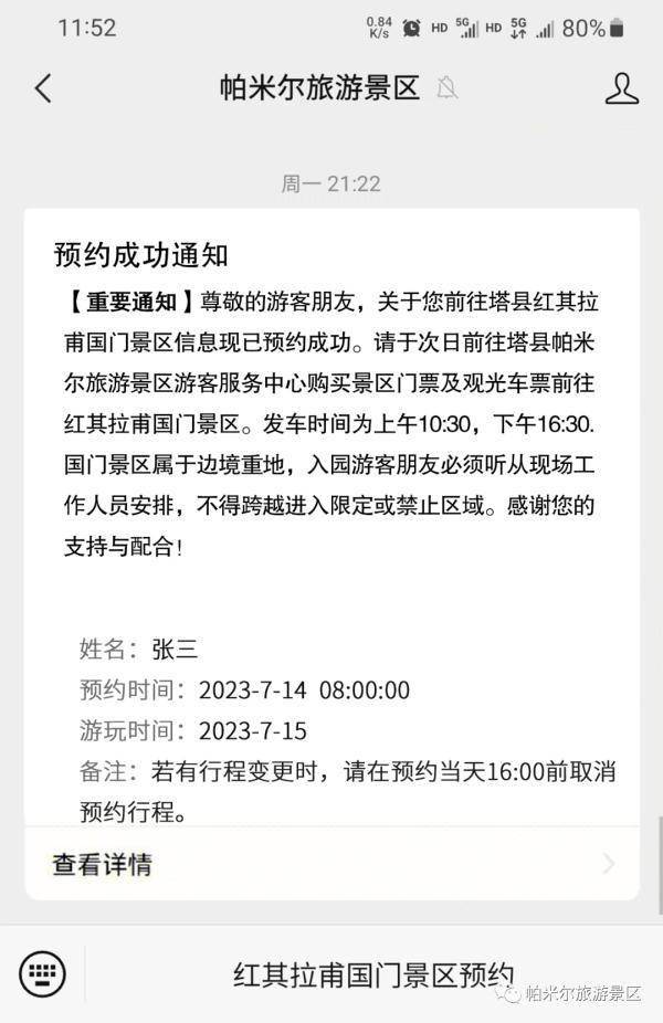 1.景区预约及购票:红其拉甫国门景区采用实名登记预约的方式,游客须通过关注微信公众号“帕米尔旅游景区”进行线上预约,在通过系统核查后方可前往游客服务中心购票。(注:2023年7月14日开始预约,时间为8:00至16:00,以此类推。每次需提前一天进行预约。)