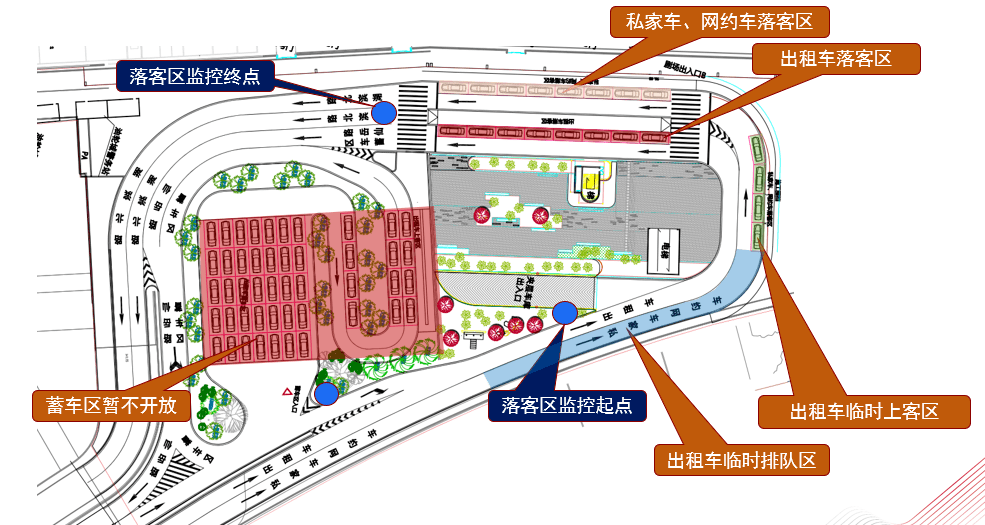 1、出租车、网约车和私家车落客区实施5分钟限时通过;