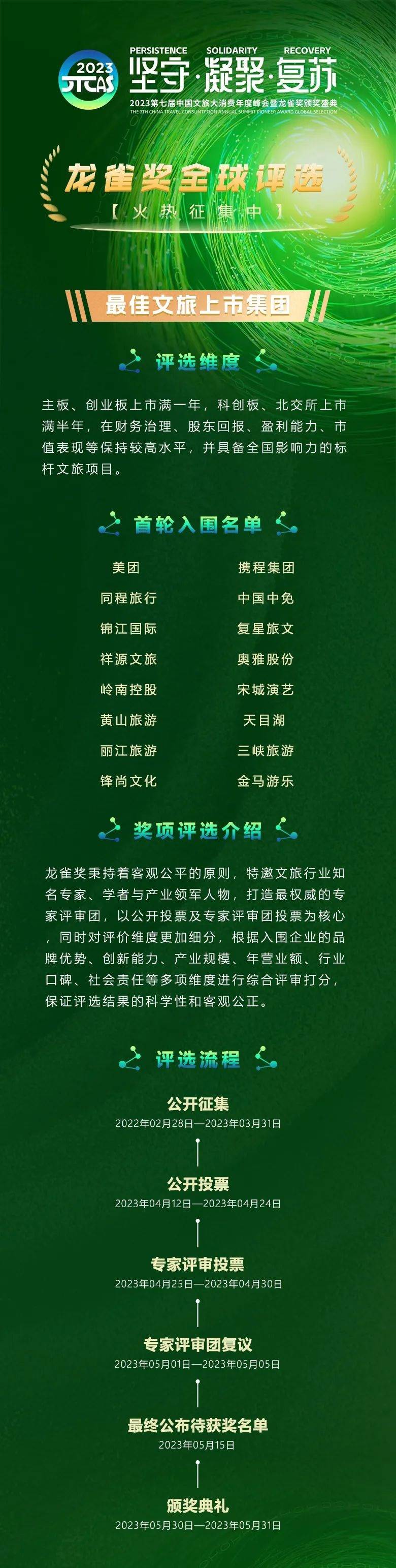 而在行业整体复苏的大趋势中,上市集团是引领复苏的中坚力量之一。第七届“龙雀奖”最佳文旅上市集团榜单面向在A股、美股、港股上市,年度市场表现优异的文旅企业,依据经典模型指标与维度,力求全面、客观地评价上市企业的综合实力与价值。