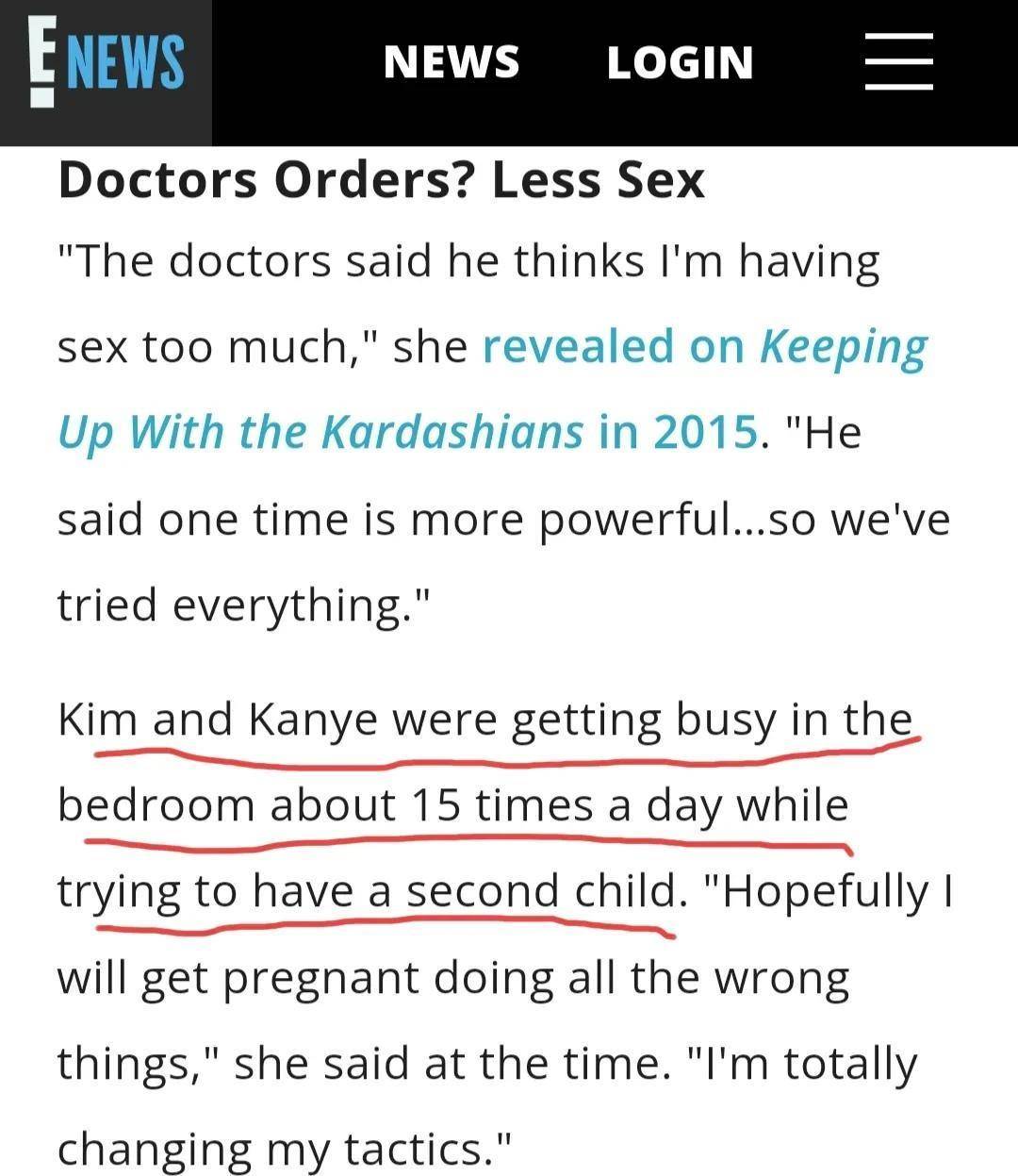 “Kanye和我每天在卧室里做了15次,希望我能怀上第二个孩子,所有的尝试都错了。现在我正在改变策略。”