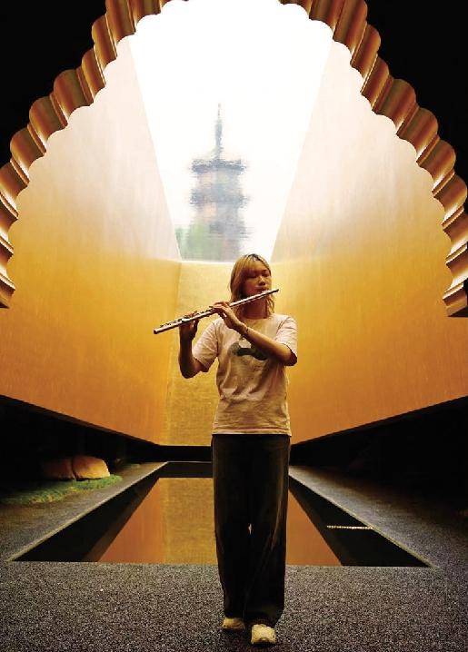 ▲图为长笛手范佳颖在龙华塔影空间演奏。