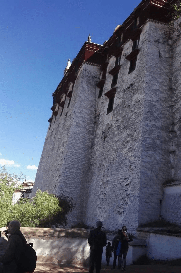 从远处看,布达拉宫层次分明,红白相间,下为白宫上为红宫。白宫因外墙白色而得名,红宫位于布达拉宫的中央位置,外墙为红色。至于为什么分红白二色,那就是另外的故事了。宫墙内还有山前部分,叫“雪城”,面积也达3万多平方米。