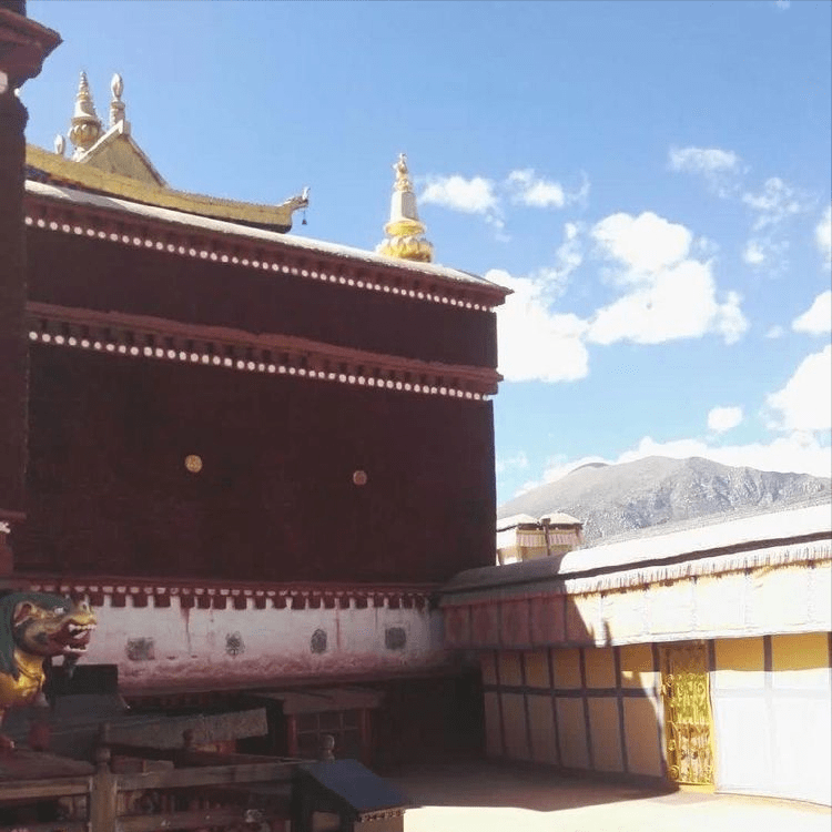 站在顶层看到的金屋顶,往上可以看远方的群山,往下可以一览拉藏的风貌和下面的布达拉宫广场。