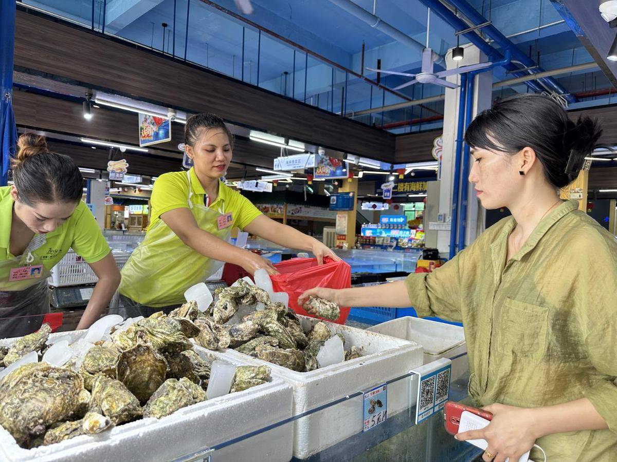 (消费者在三亚湾龙兴海鲜广场购买海鲜 陈博文摄)