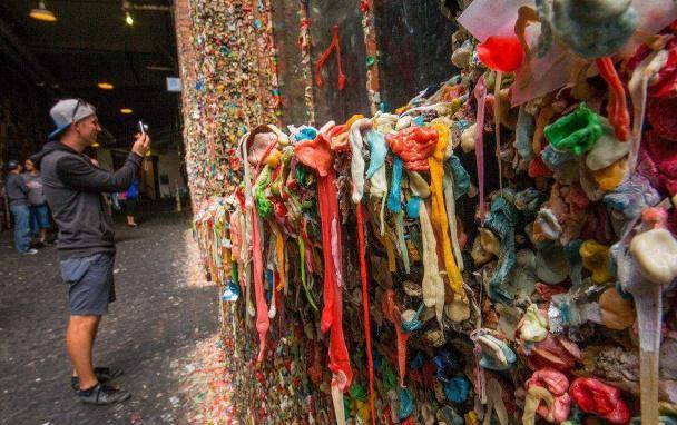 第一个,是美国西雅图的口香糖景区,这个景区的墙壁从远处看,五颜六色的,十分壮观。但是走进后才发现,这些美丽的东西竟然都是口香糖,它们一个个紧密地贴满了墙壁。并且在夏天的时候,这些口香糖会发出一些很严重的恶臭味。但是游玩观赏的人还是很多,看来这样的味道,根本就不算什么。