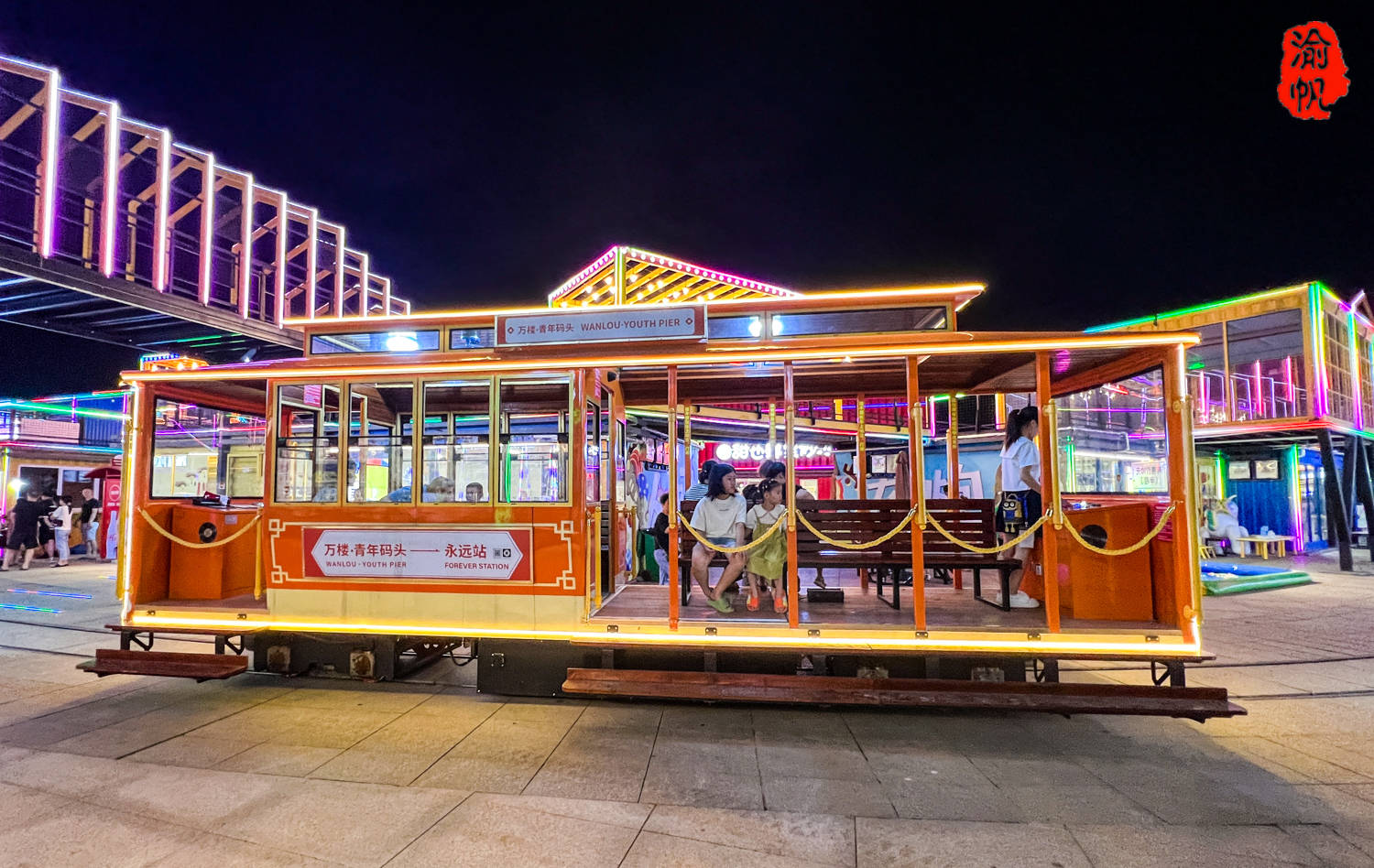 万楼青年码头虽然不大,但是好玩的的确很多,里面还建有轨道观交光列车,速度不快,但体验很好,坐在上面,看着眼前流光溢彩的店铺,如同现代版的清明上河图一般。