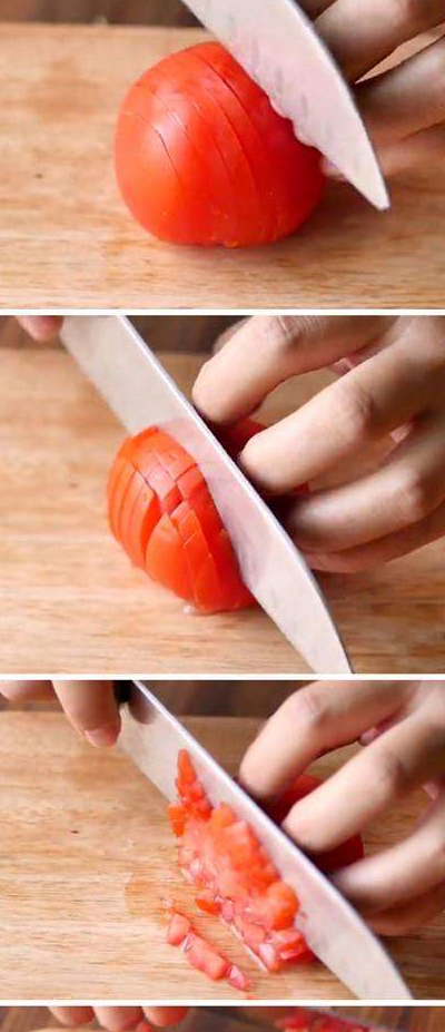 2.切一些香葱段,接着就切西红柿了,用量大概是一斤。汤要做好喝,这番茄要切得细。切得优雅,砧板不用剁得老响,轻松搞定,只需三步。第一,给西红柿像图一那样划刀,越细越好。切的时候要注意,不要切断底部。第二,把西红柿翻一个身,让刚才的刀纹从横变成竖,然后我们再横刀下去便行,这样切出来就成了网格。也是一样操作,不能切断西红柿底部。第三,切好网格纹以后,我们把底部翻过来,底部朝手心,顶端就朝外了,这时候我们再切,就能切成一粒粒细小的西红柿了。完全不用大动作,优雅完成,完美!这方法很好,学好以后用吧。