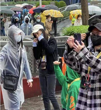 依旧baby和小海绵玩的还不亦乐乎,母子两个人手拉着手在雨里慢不得行走,那种画面真的是温馨和体贴,baby杨颖当天下身穿着牛仔裤,上身穿着一件黑色的T