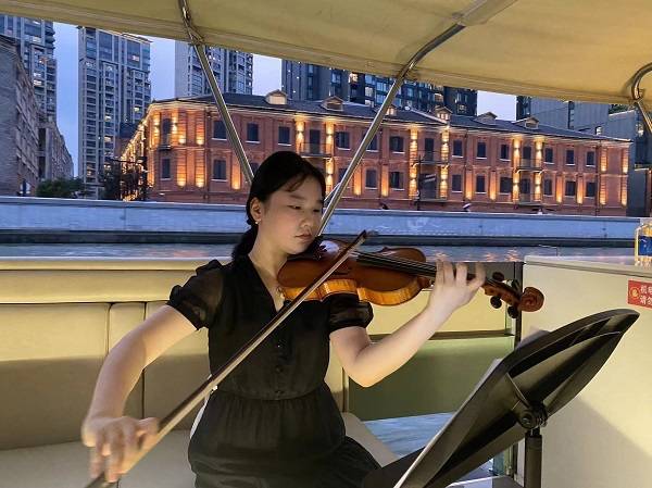 游船刚离开外滩源码,随船的演奏者表演起《茉莉花》小提琴独奏,听着温暖而治愈的旋律,不少游客倚靠着游船沙发,静静地欣赏苏州河夜景。表演者黄毛毛介绍,他们精心挑选了舒缓、悠闲的曲目,为夏日的游客送上一份“清凉”。“第一次走下舞台,坐在船舱里演奏,感觉非常奇特,可以和听众零距离交流。”黄毛毛说,游客们更喜欢熟悉的曲目,时而闭目欣赏,时而会心一笑,似乎勾起他们不少美好的记忆。