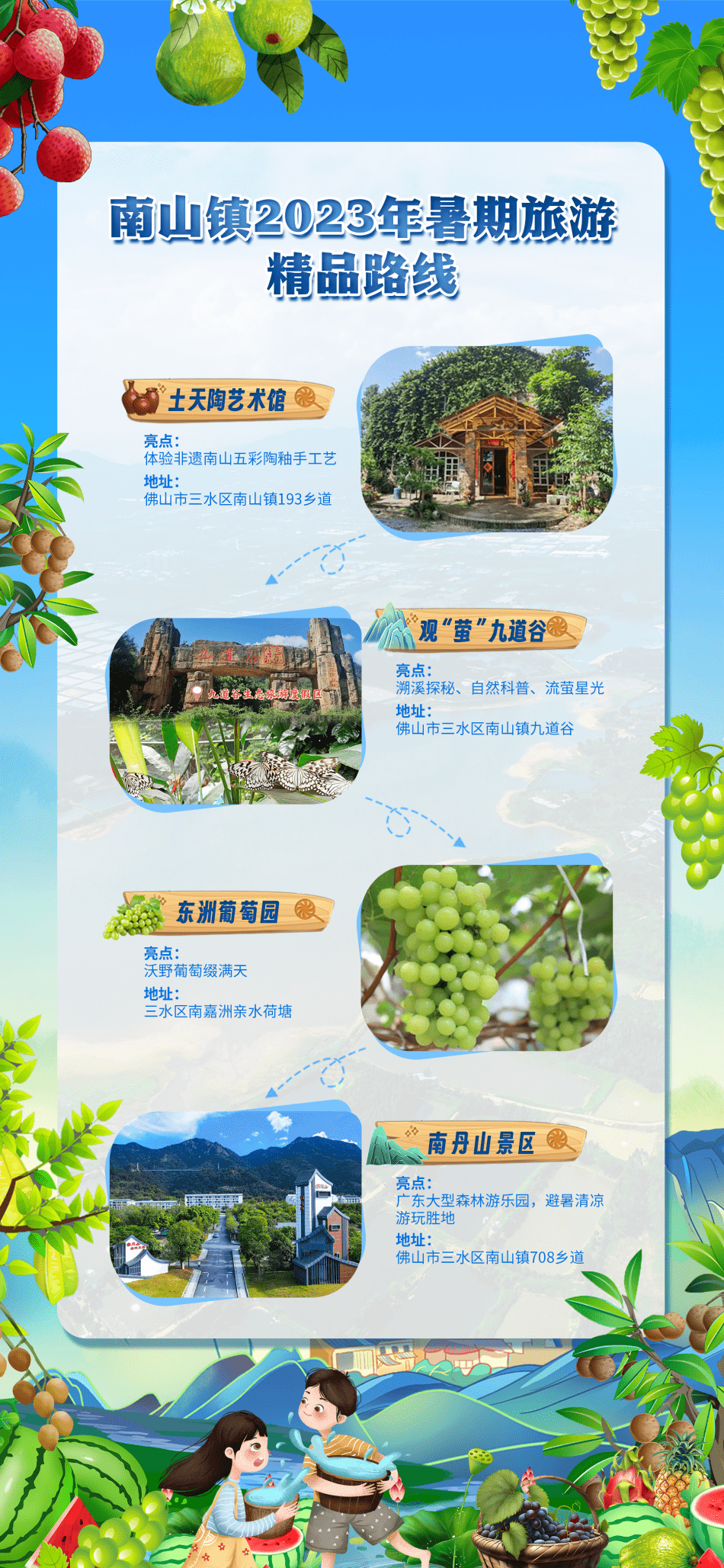 十里水果长廊采摘节暨南丹山森林王国泼水狂欢节系列活动期间,南山镇还将组织湾区车友,开启一场说走就走的南山“寻果之旅”,沿着非遗艺术、水果采摘、山林风光为主题的2023年暑期旅游精品路线,唱响研学文旅寻果之旅。