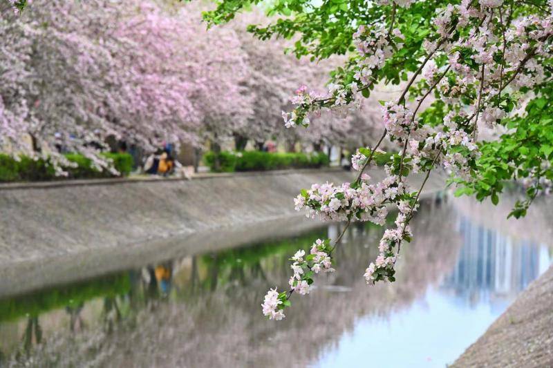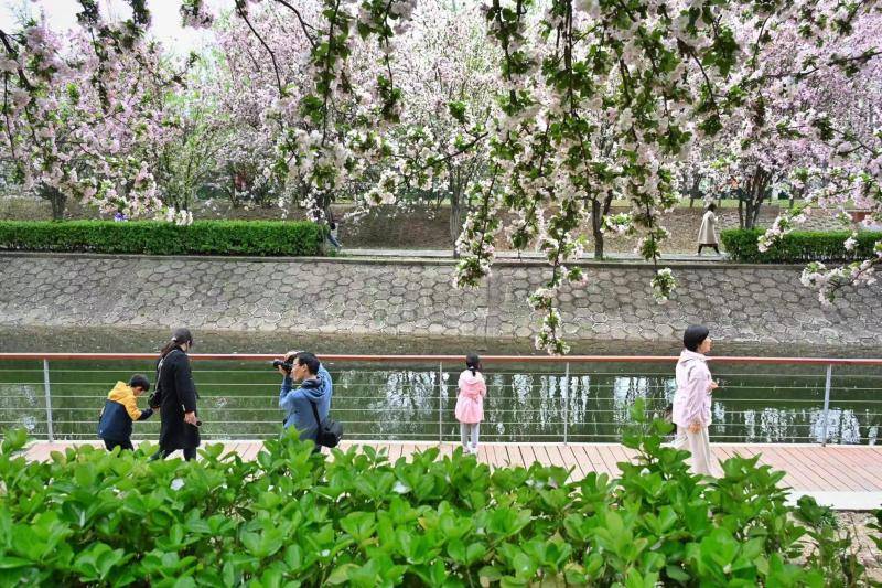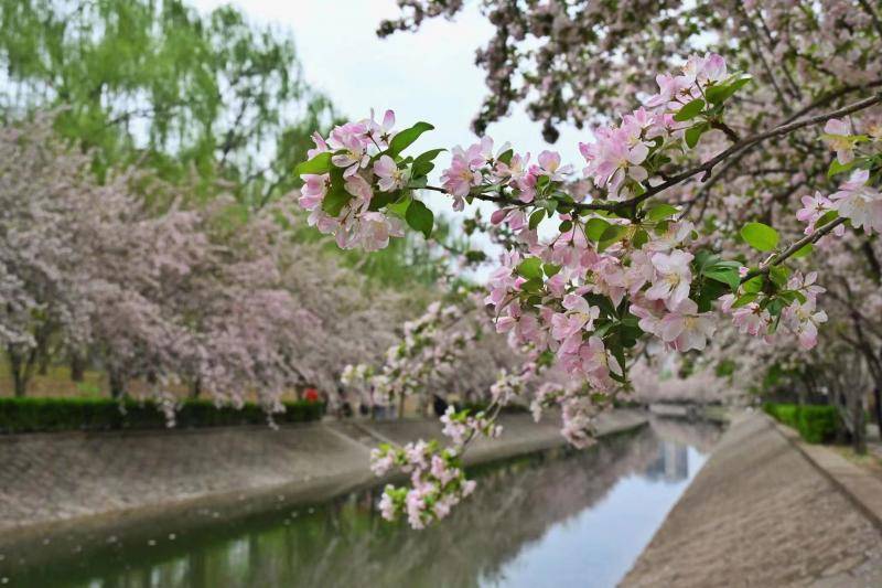 近日,在朝阳区望京沟两岸,海棠、碧桃等盛放,云蒸霞蔚,成为社交平台上新晋的网红打卡地,吸引不少市民前来打卡。